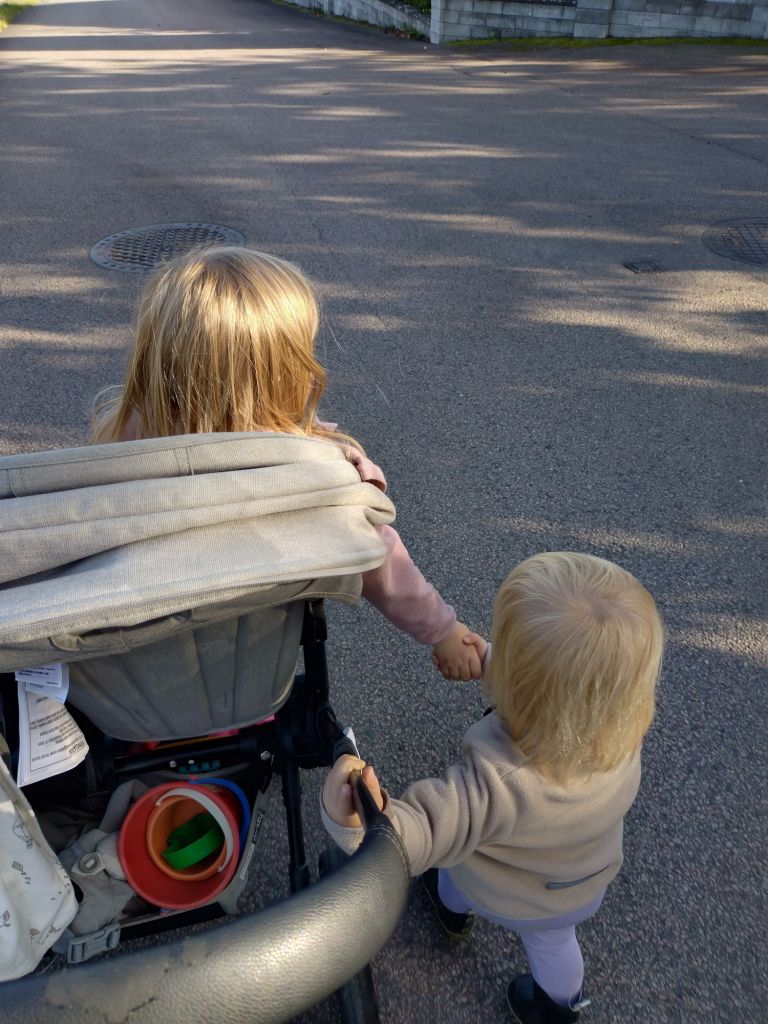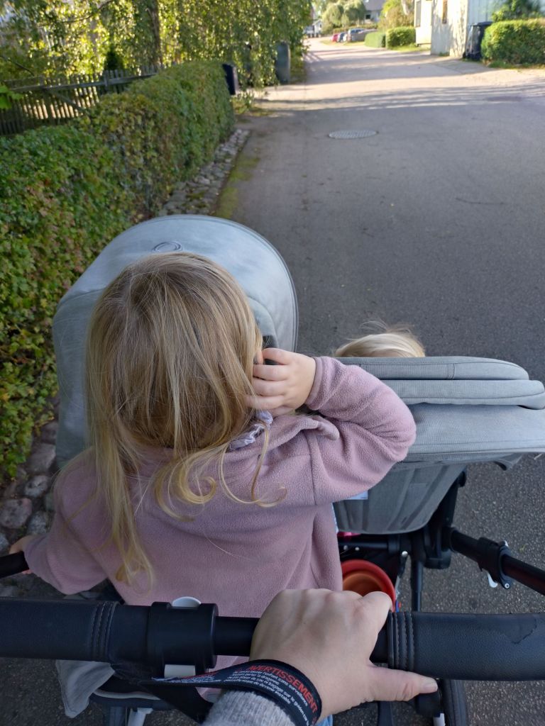 1,5 åringen vaknade vid kl. 13:30 idag. Vi brukar fika ganska direkt efter att hon vaknat. Idag blev det yoghurt och flingor till fika. Jag hade lovat barnen att vi skulle gå till lekplatsen på eftermiddagen så det gjorde vi. Det är så fint att se utvecklingen hos barnen och i deras relation. De lekte så fint tillsammans på lekplatsen och lekte mer tillsammans än vad de skulle ha gjort för bara några veckor sedan. Jag lyssnade lite på en podcast under tiden vi var på lekplatsen i och med att flickorna lekte så fint med varandra. Bebisen har precis fått byta till sittdel i vagnen så han var så nöjd med att bara sitta och titta på när storasystrarna lekte på lekplatsen.