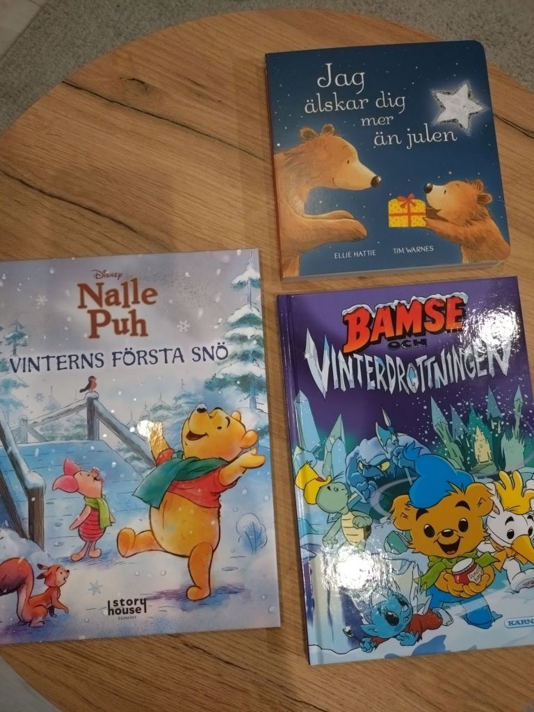 Det är roligt att få skapa traditioner och roliga minnen för barnen kopplat till just advent. Tidigare år har barnen fått en gemensam pixibokskalender men i år ville vi göra på ett annat sätt. Vi kommer därför att ge barnen en present varje söndag. Jag vill försöka ge presenter som skapar möjlighet till aktivitet och gemenskap under december. Nu första advent fick barnen varsin julbok, vi har inte så många julböcker sedan tidigare. Lydia fick en bok som heter Bamse och vinterdrottningen, det är en kapitelbok och det är första gången som vi läser kapitelböcker för henne. Det är 24 kapitel så vi kommer läsa ett kapitel varje dag fram till julafton. Hon blev verkligen så glad och kom tillbaka flera gånger och tackade för sin nya bok. Rut fick en bok som heter Nalle Puh, vinterns första snö och Josia fick en bok som heter Jag älskar dig mer än julen. Vi köpte alla böcker på Ullared och sammanlagt kostade de 137 kr.