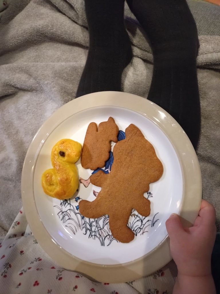 Efter vi hade bakat några plåtar så satte vi oss framför teven för att kolla på julfilm och fika på lussekatter och de nybakta pepparkakorna. Det blev Nalle Puh filmen ”Vännernas fest”. Flickorna tyckte om filmen och även jag och maken tyckte om den. Nalle Puh är mycket nostalgi för oss båda.