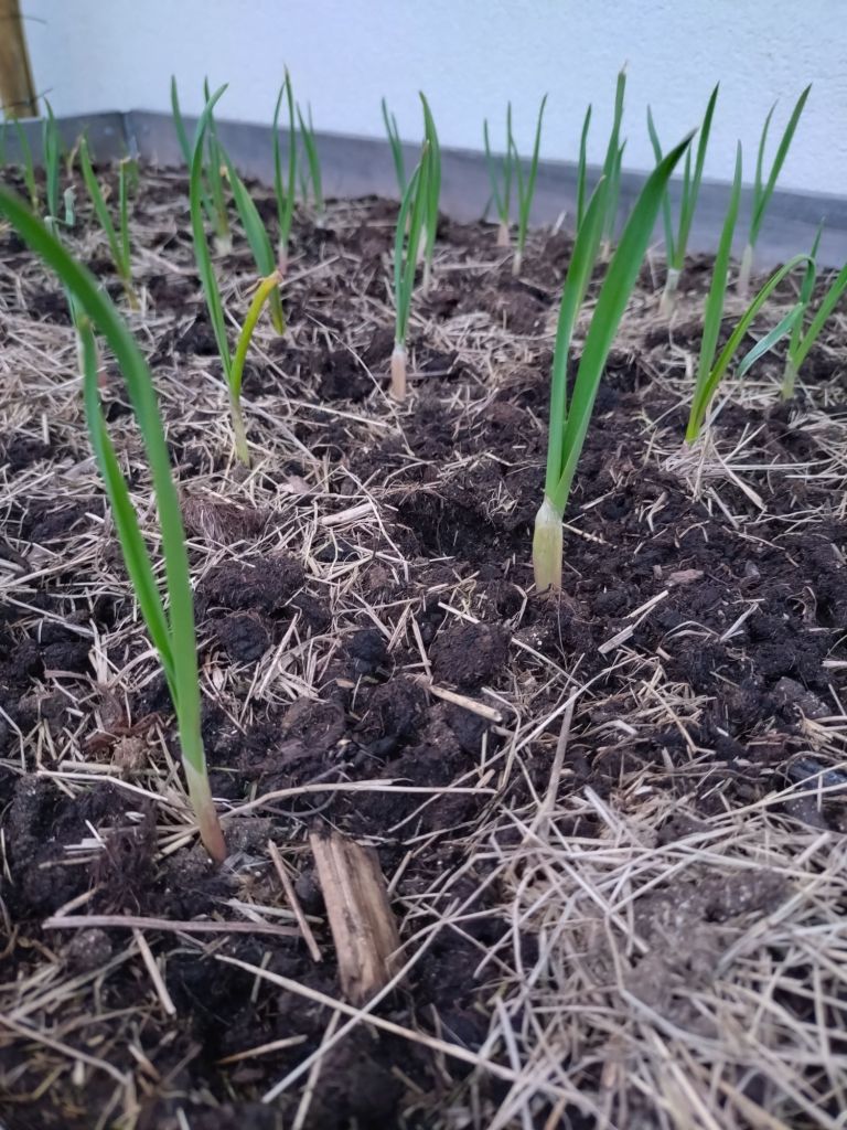 Jag var lite orolig under vintern när jag tyckte att det såg ut som att jordgubbs- och smultronplantorna dött men nu kommer det nya gröna blad från nästan alla plantor, det är bara två som ännu inte visat livstecken. Våra bärbuskar har fått knoppar och vitlöken har nästan blivit 10 cm hög, det verkar som att alla har tagit sig.